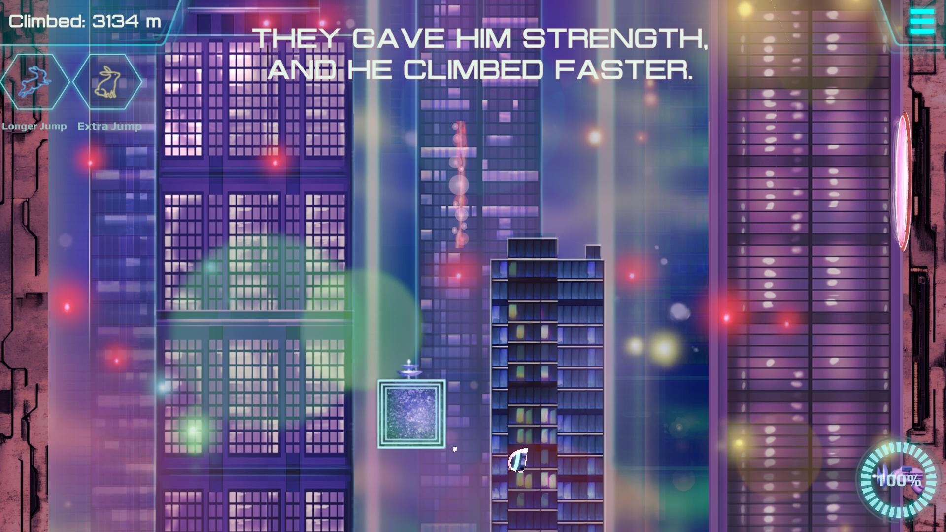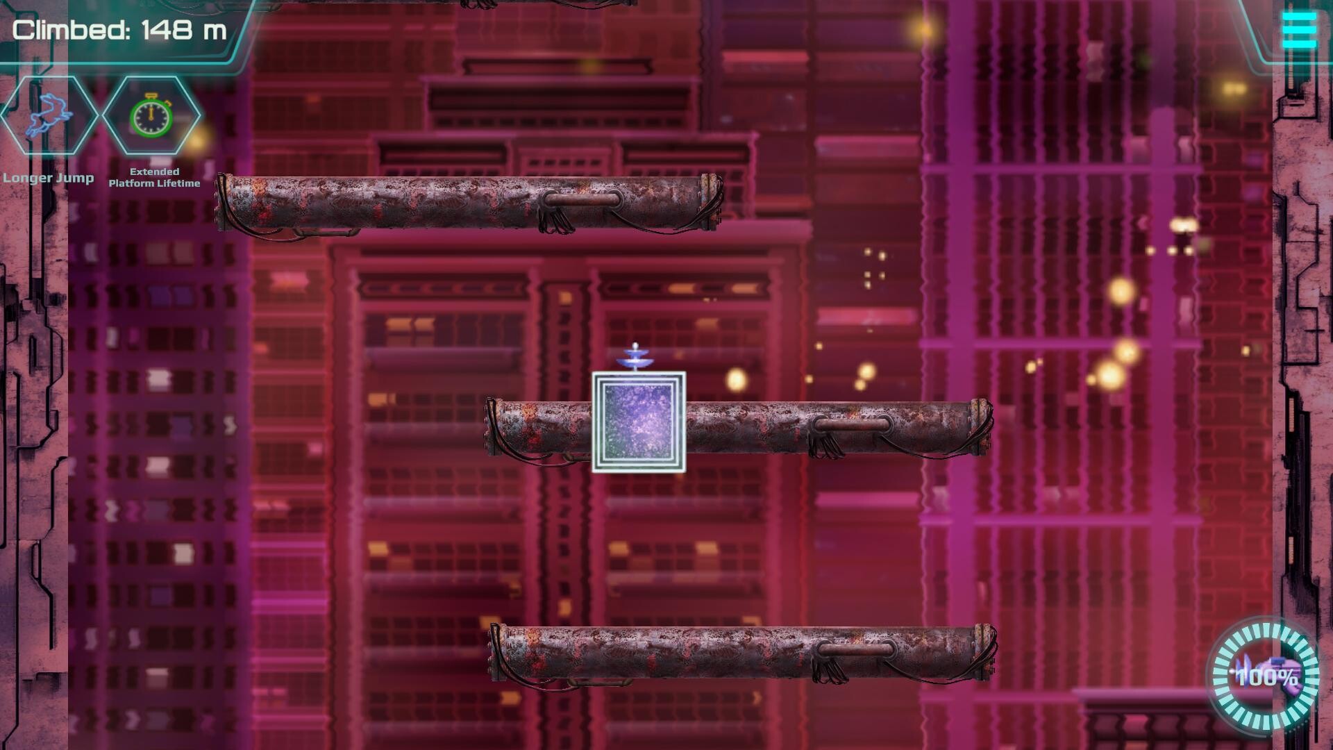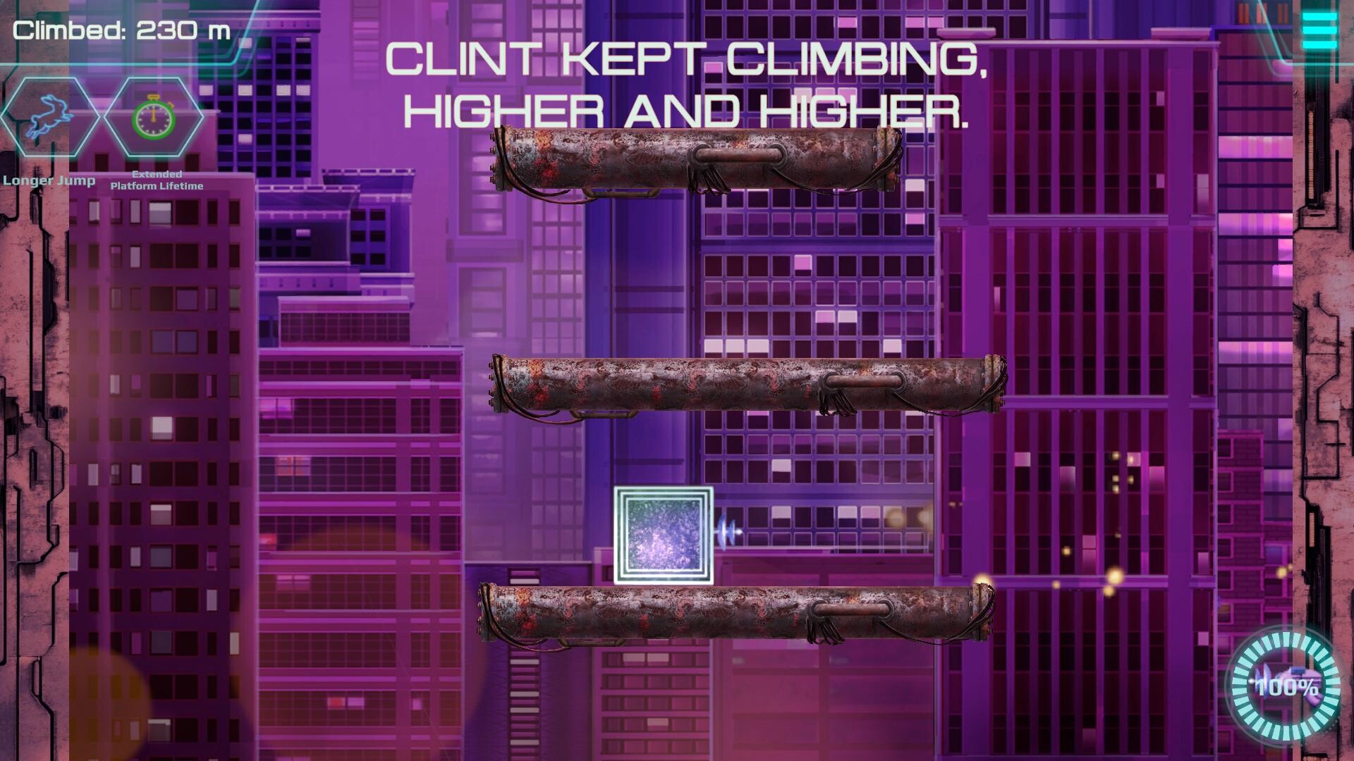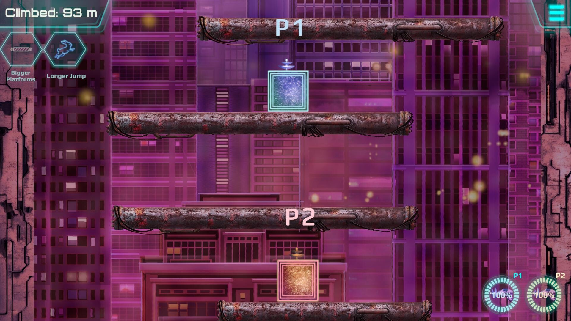 Climb fast or fall. In this neon cyberpunk platformer, every jump counts—fire energy waves, create platforms on impact, and push your limits solo or in local co-op.