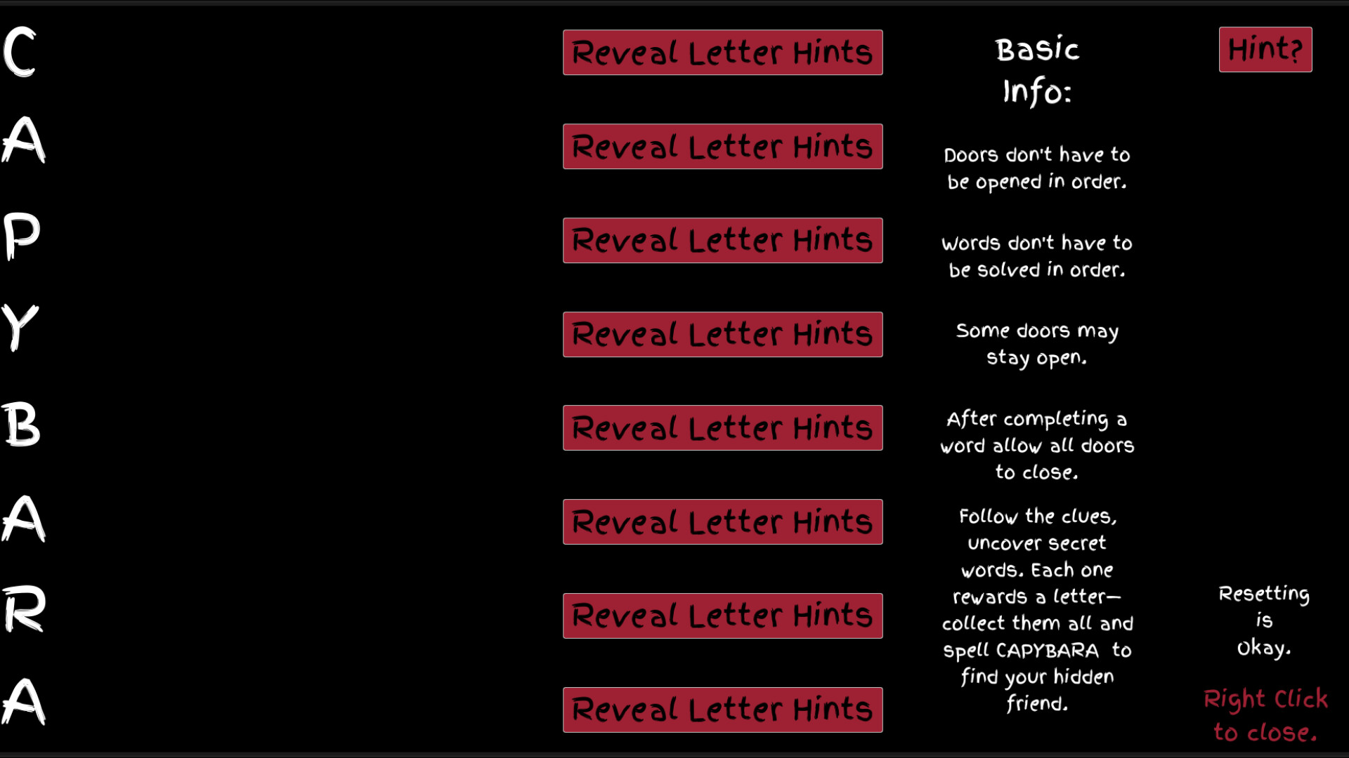 A single-player psychological horror puzzle built around memory and words. Solve hidden clues by spelling them out with the doors in the correct sequence, but as letters fade and resets occur, only your understanding of the maze will let you escape.