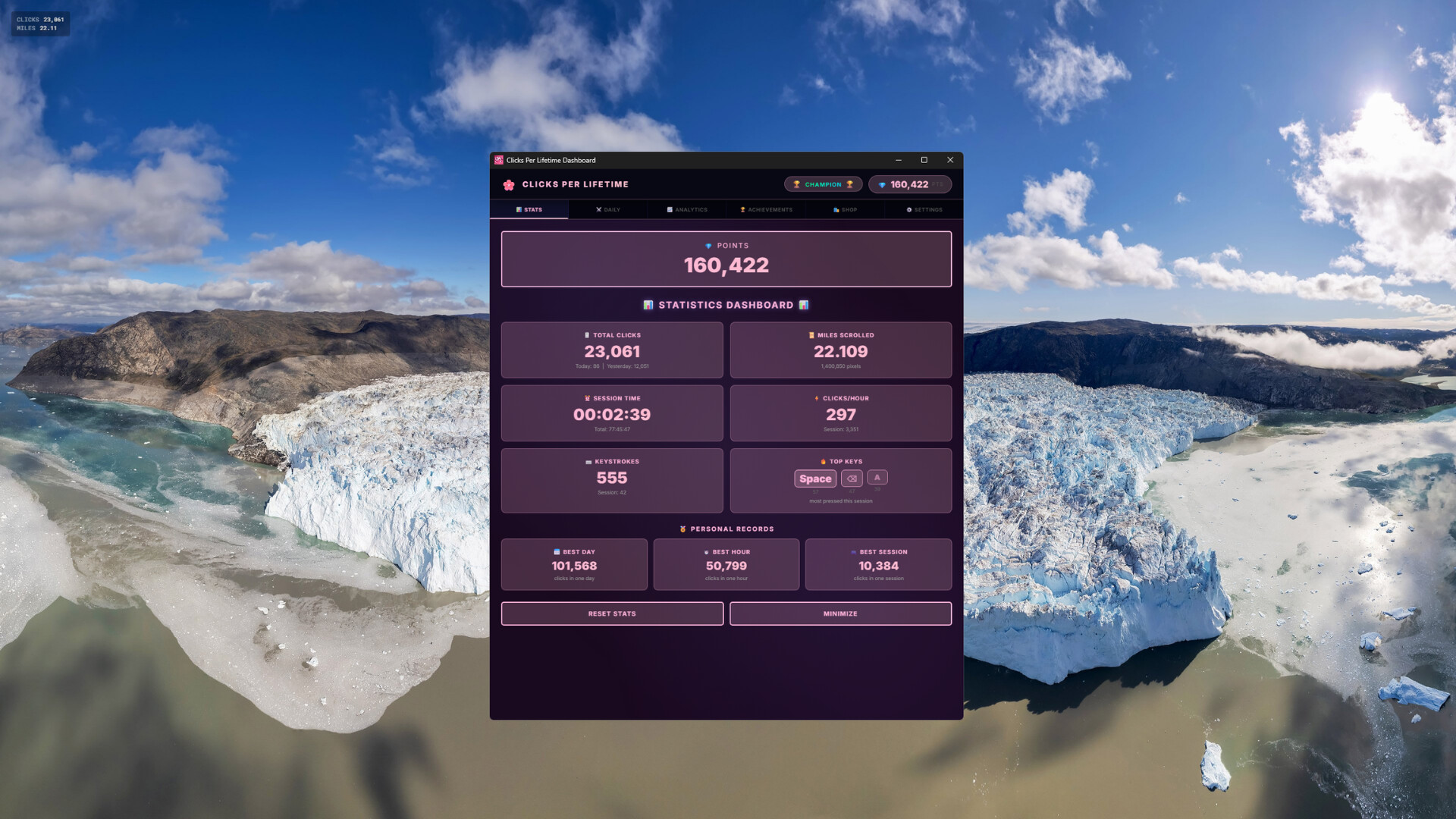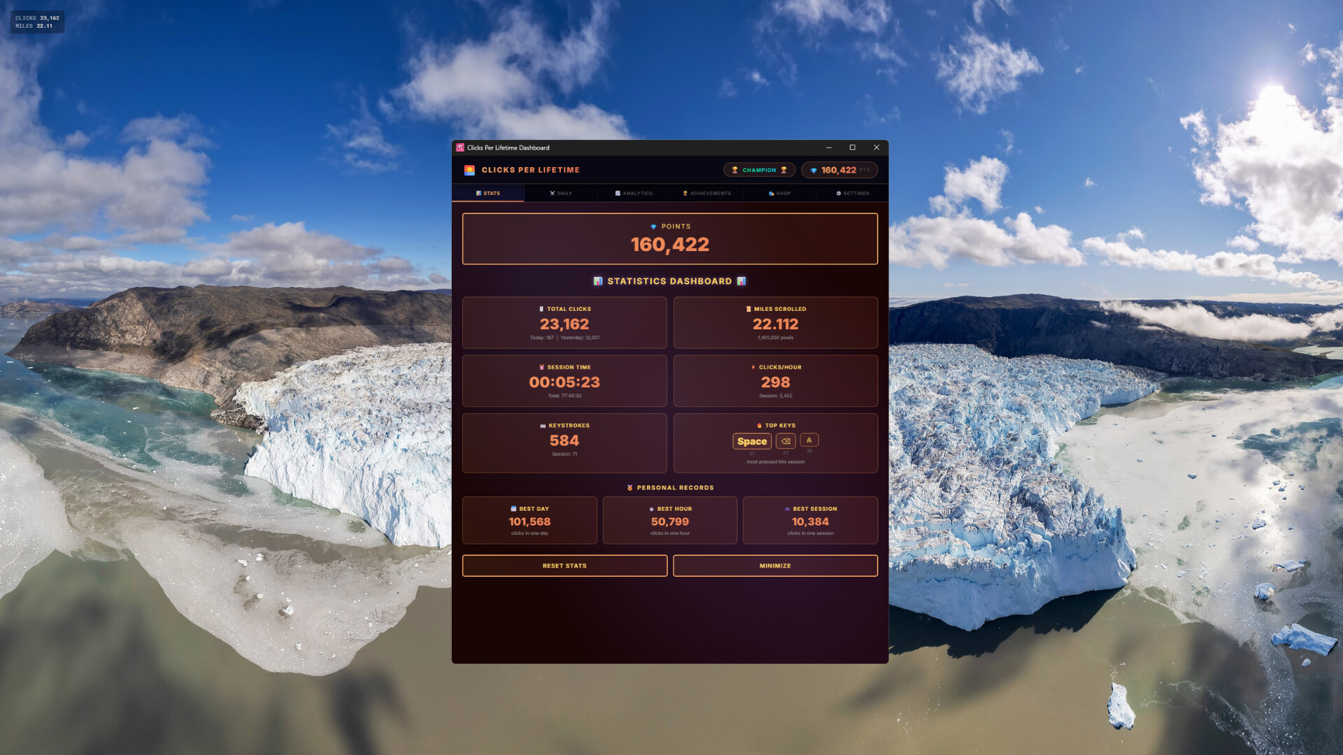 Track every click, and scroll of your life. Earn points, unlock achievements, complete daily challenges, and discover just how far your fingers have traveled. How many clicks will your lifetime hold?